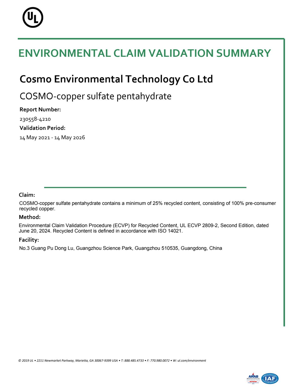 Complies with the industry standard “Copper Sulfate for Electroplating” (HG/T 3592-2020)