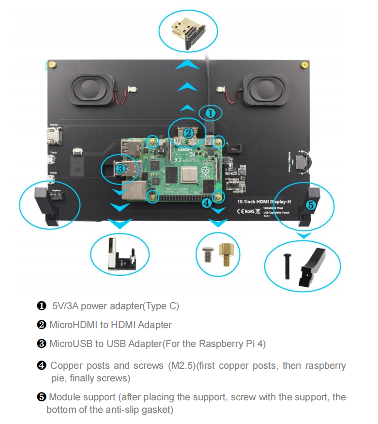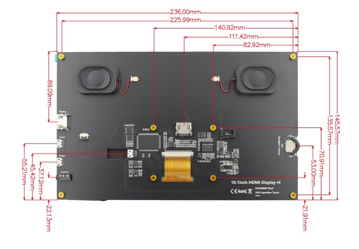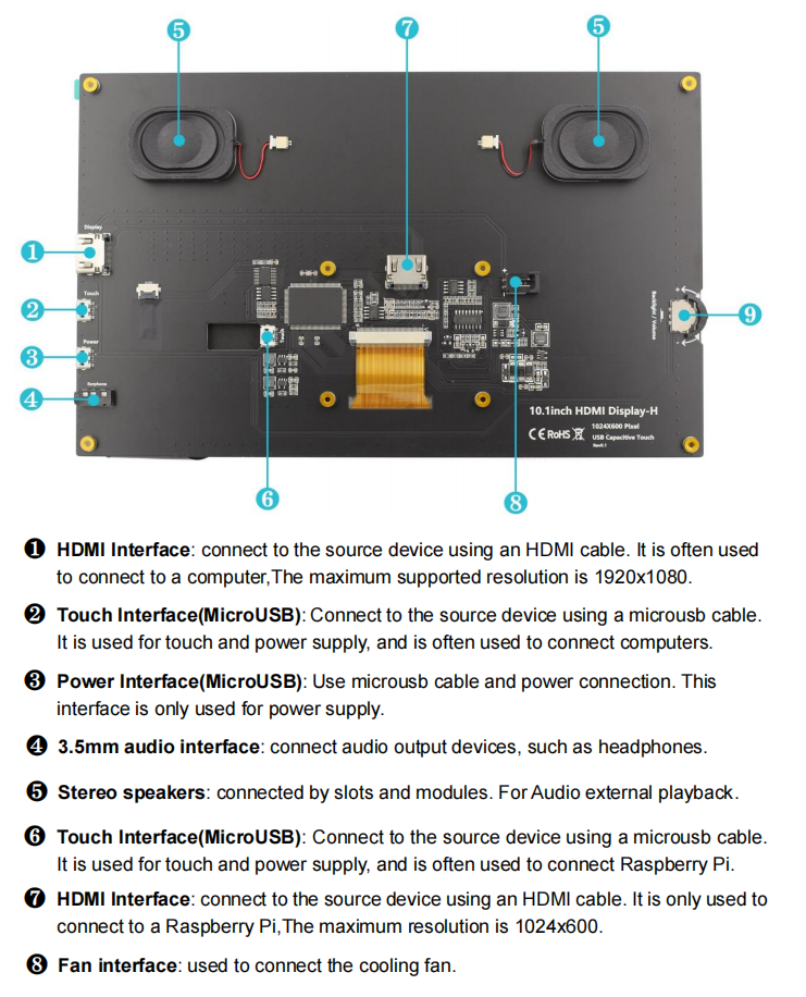 The 10.1-inch IPS full view display has large visual angle, real color and excellent image quality The resolution is 1024x600, and the display screen is exquisite Toughened glass touch panel, hardness up to 6h, durable and scratch resistant Capacitive touch screen, up to support 5 touch points The HDMI HD input interface can be used for HDMI display Self-contained stereo dual speaker for external audio playback External 3.5mm headphone output port, supporting audio output independent dial switch, support backlight brightness and volume dual adjustment Those supporting mainstream development boards such as raspberry pie, banana PI and BB black For raspberry pie display, support raspbian, Ubuntu, Kali, win10 IOT and other systems, touch free drive It can be used as computer monitor, support win7 / win8 / win10 system, and touch free Those used as game console display, supporting PS4, XBOX360, switch, etc. The product has passed CE and ROHS certification