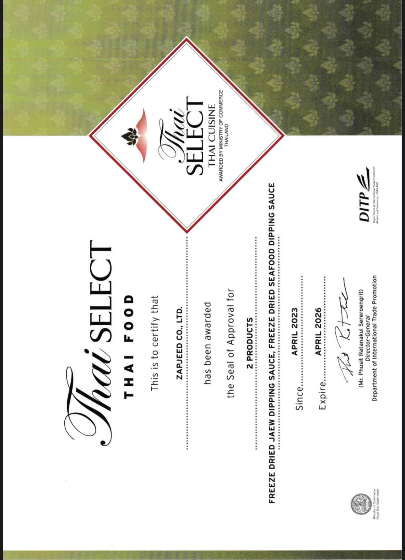 ZAPJEED’s Jaew dipping sauce, presented in a 7-gram aluminum foil cup, captures the bold and distinctive flavors of Northeastern Thailand (Isan). This signature blend features the rich, smoky heat of dried chili, the tangy brightness of fresh tamarind juice, and the aromatic depth of toasted rice powder.