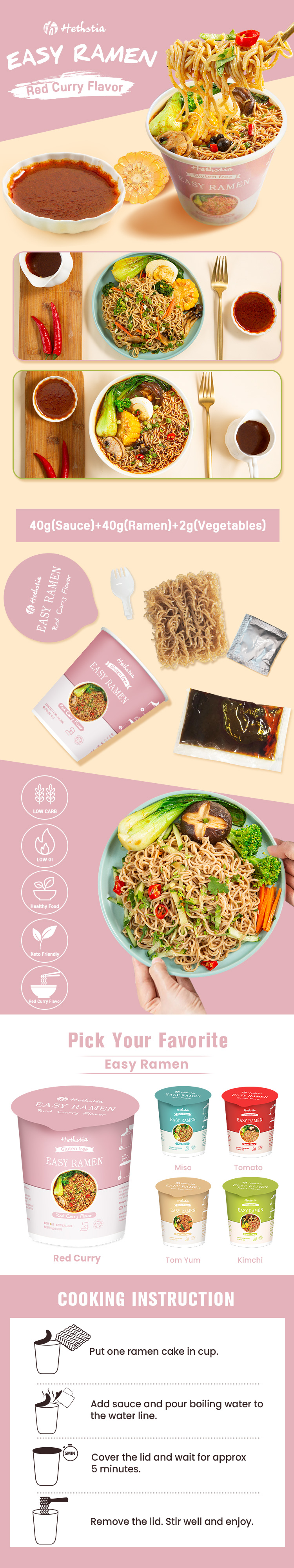 Our red curry flavor shirataki noodles ramen are low-fat, rich in nutrients, and satisfy the needs of diners who pay attention to health and taste. Each serving of ramen contains 235 calories, 4g of protein, and 46g of carbohydrates.