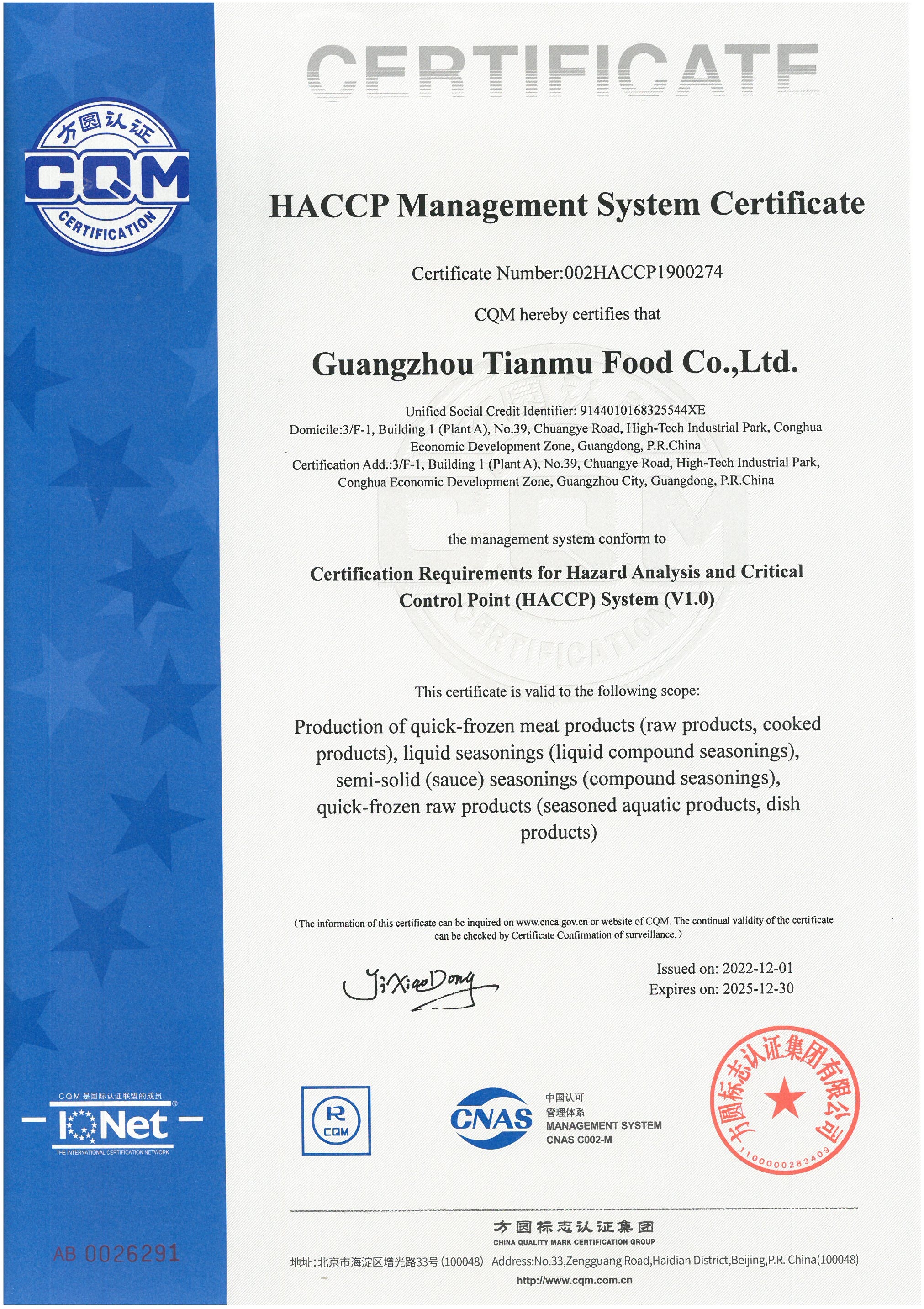 HACCP Managment System Certificate