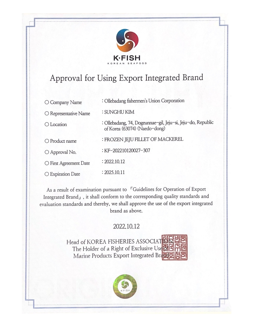 Among the numerous frozen mackerel products, Hanolle Jeju mackerel fillet is the only one certified by K·FISH