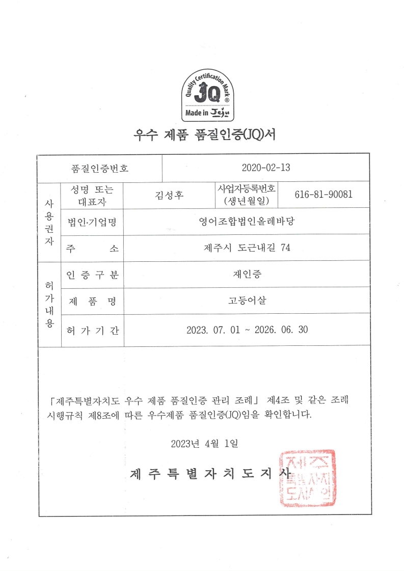 - 2020 JQ Jeju Quality Certification