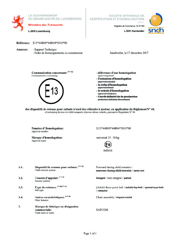 YY01 CERTIFICATE OF ECE R44/04