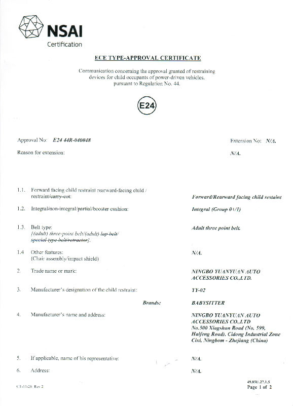 YY02 CERTIFICATE OF ECE R44/04