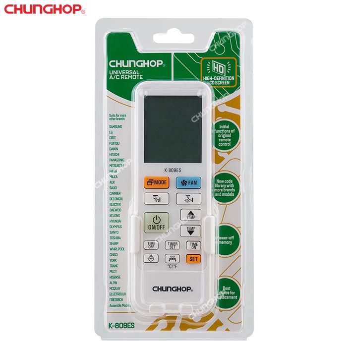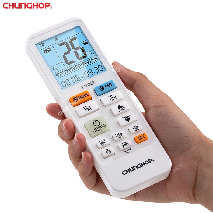 K-809ES is a universal A/C remote control with an extre-large backlight LCD screen, clear buttons, weekly timer setting function. With a powerful and upsated built-in code library, it is suitable for 99% A/C brands and models in the global markets. It is the best choice for damage, loss, and replacement of your remote control.