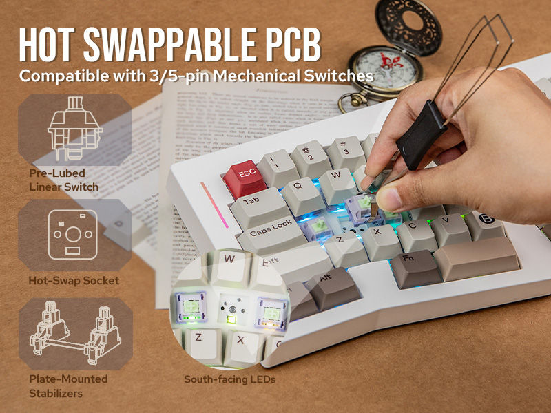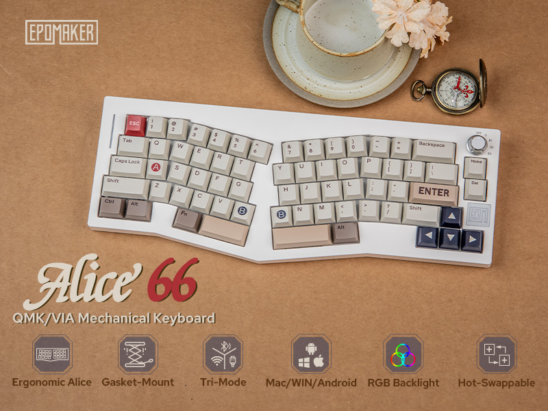 Engineered for both comfort and convenience, the Epomaker Alice 66 features a gasket-mounted design that enhances the overall typing feel by adding a slight flex to the keyboard structure.