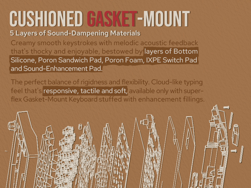 It features a silicone bottom pad, an IXPE switch pad, and two layers of Poron foam sandwiched between the plate and PCB to absorb shock and mellow the sound profile. Additionally, the PET Sound-Enhancement pad accentuates the switch's deep 'thock,' creating a tranquil and pleasant typing