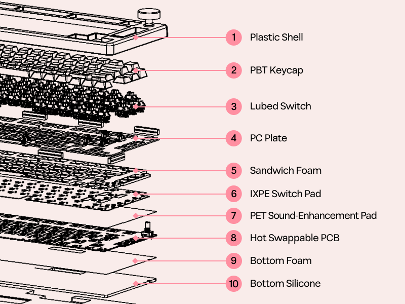 Experience the pinnacle of typing bliss and gaming tranquillity, with the Gasket-Mounted QK81 cushioned with 5 layers of sound-dampening materials.