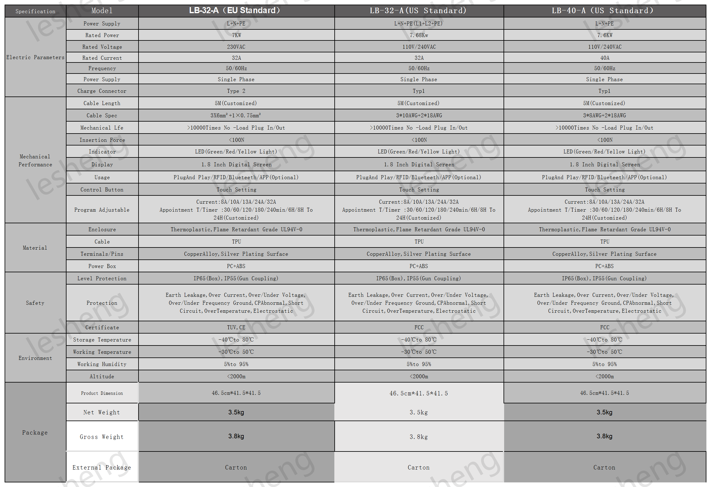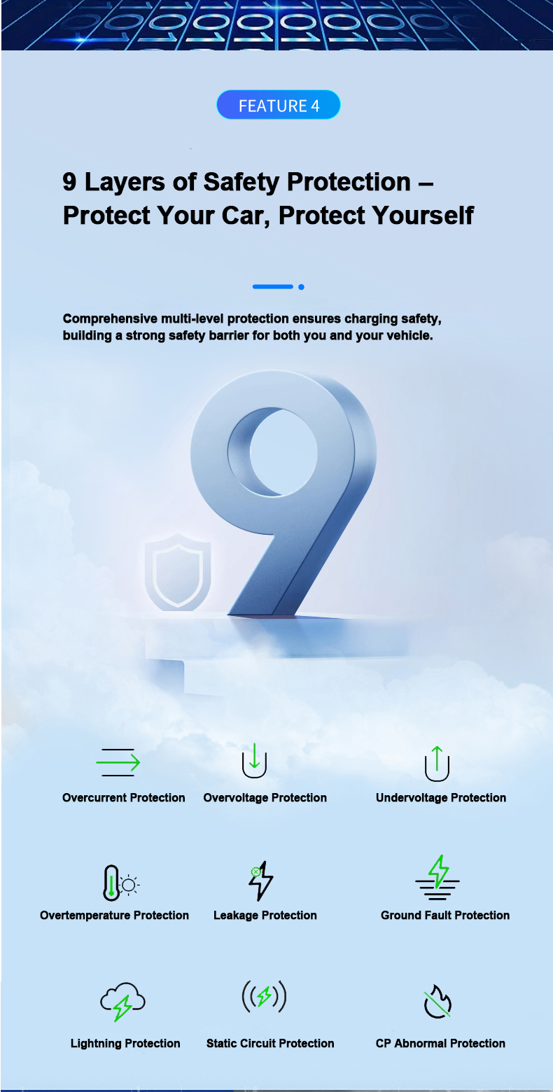 Ground Protection,Leakage Protection, Over Current Protection,Over/Under Voltage Protection,Short Circuit Protection,CP Abnormal Protection,Temperature Protection,Electrostatic Protection,Surge Protection