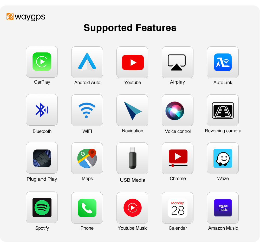 Product Features: | Apple CarPlay, AirPlay,Android auto,Screen mirror,WIFI,Bluetooth, USB, Youtube |