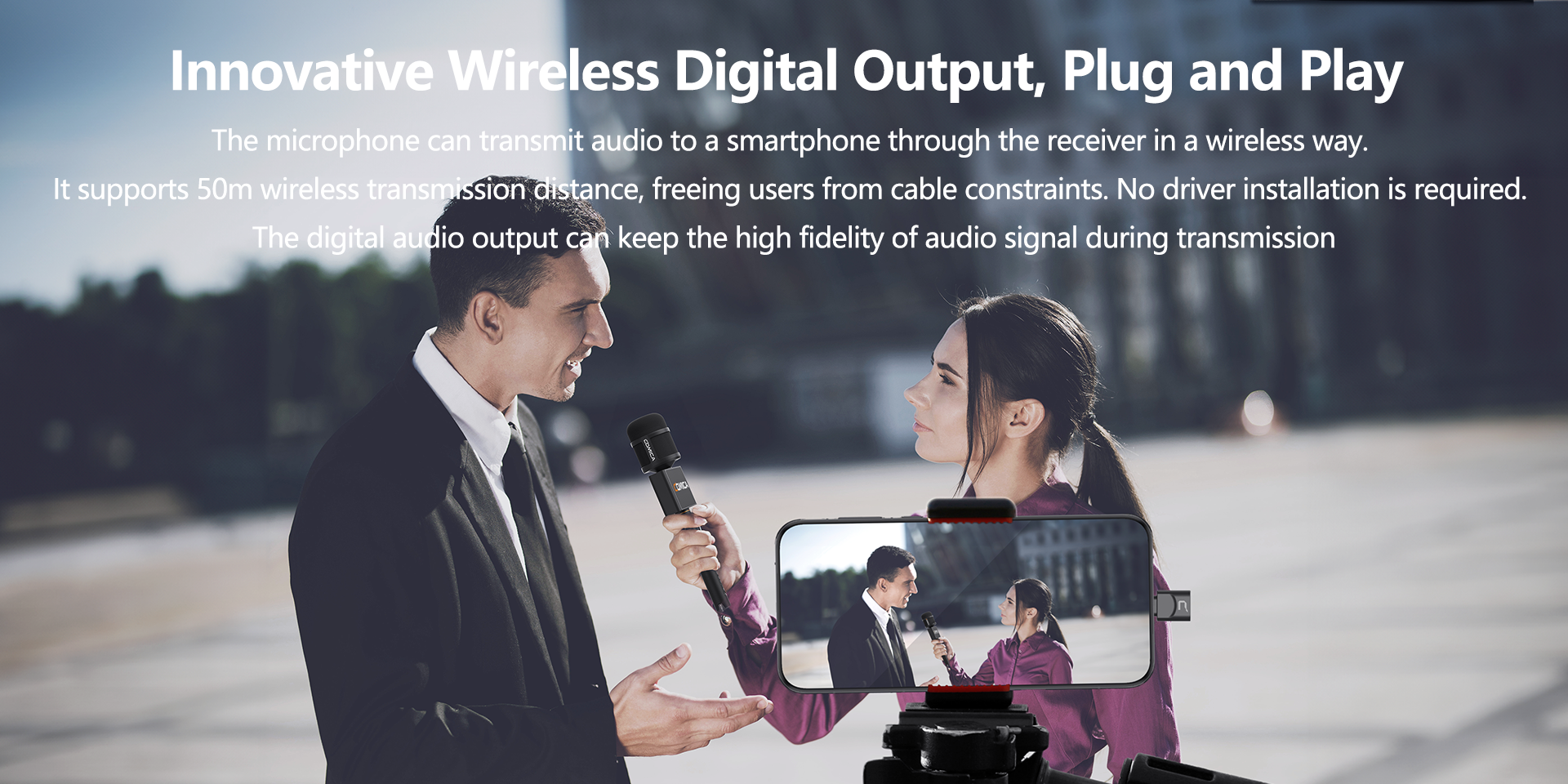 The microphone can transmit audio to a smartphone through the receiver in a wirelessway.It supports 50m wireless transmission distance, freeing users from cable constraints. No driver installation is required.The digital audio output can keep the high fidelity of audio signal during transmission