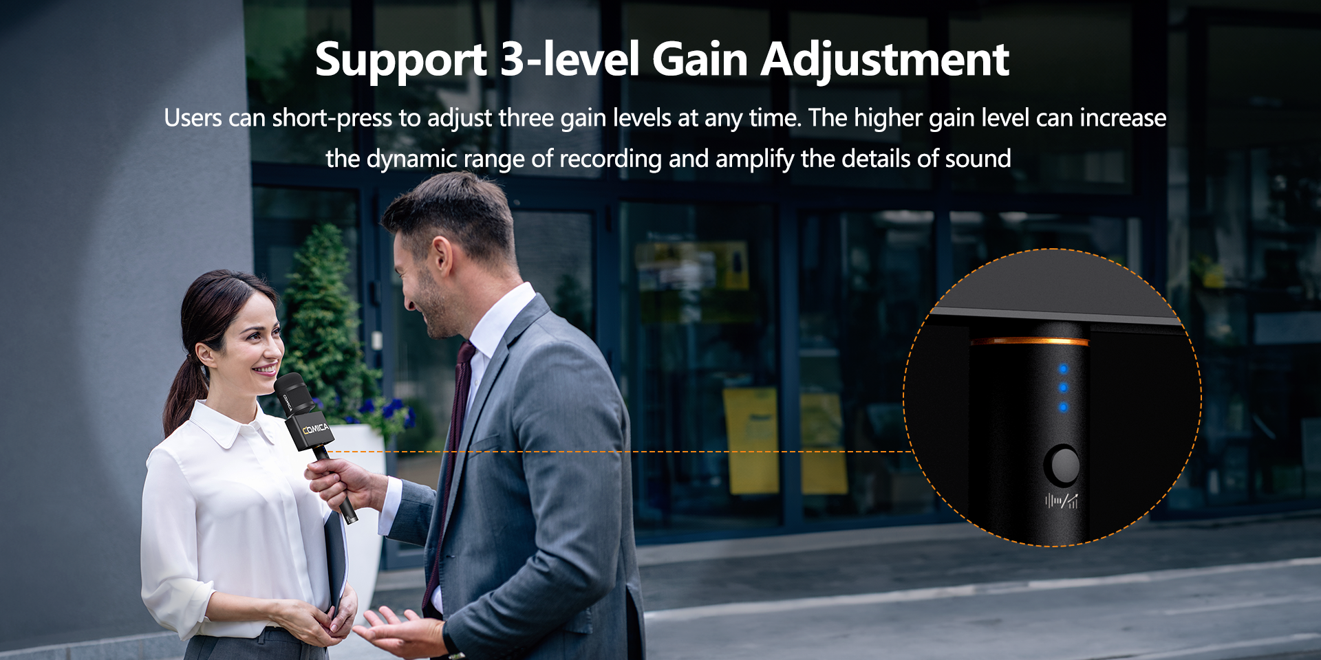 Users can short-press to adjust three gain levels at any time. The higher gain level can increase the dynamic range of recording and amplify the details of sound