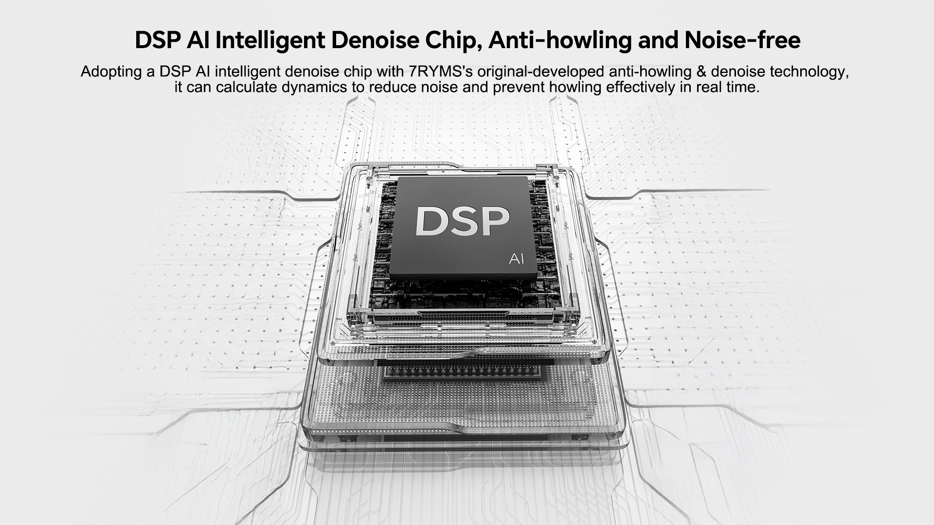 Adopting a DSP intelligent denoise chip with 7RYMS's original-developed anti-howling & denoise technology, it can calculate dynamics to reduce noise and prevent howling effectively in real time.
