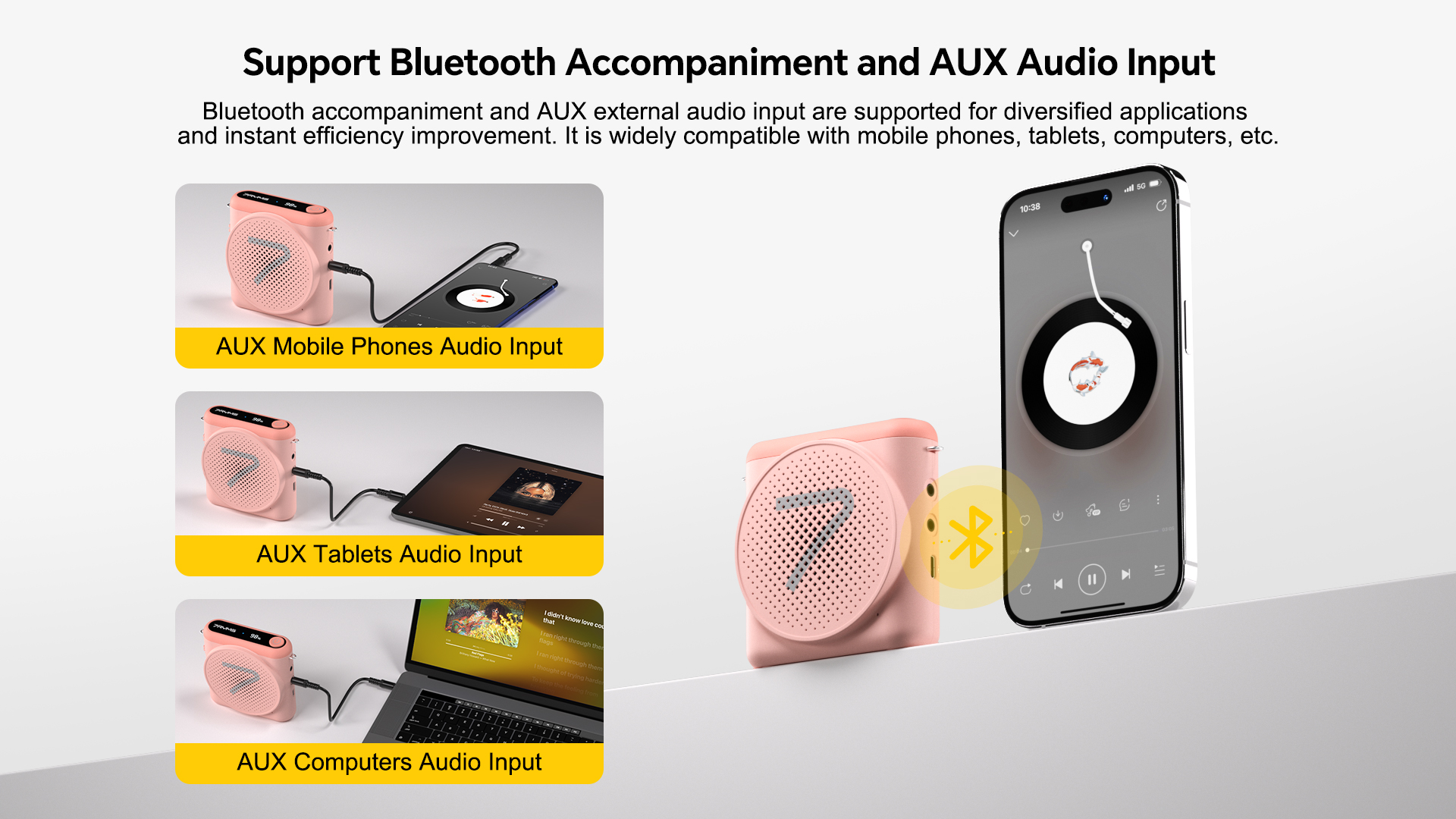Bluetooth accompaniment and AUX external audio input are supported for diversified applications and instant efficiency improvement. It is widely compatible with mobile phones, tablets, computers, etc.