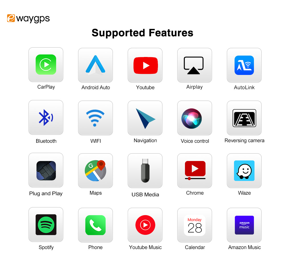 Product Features: | Apple CarPlay, AirPlay,Android auto,Screen mirror,WIFI,Bluetooth, USB, Youtube |
