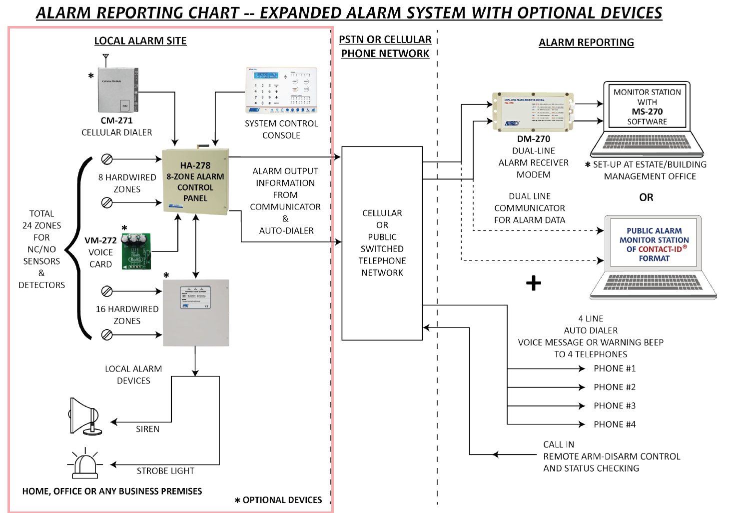 - The protection zones and the alarm output facilities are compatible with most of the sensors and output devices on the market. HA-278 is expandable to 24 zones; it is ideal security system for business and residential protections.
