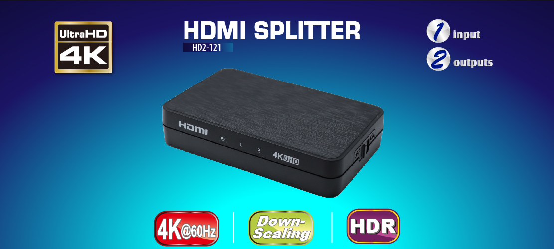 HDMI 2.0 1x2 HDMI splitter: 1 input 2 outputs, UltraHD 4K, auto downscaling | HD2-121