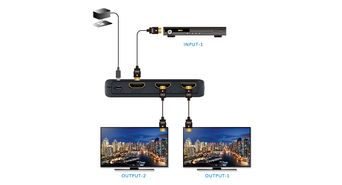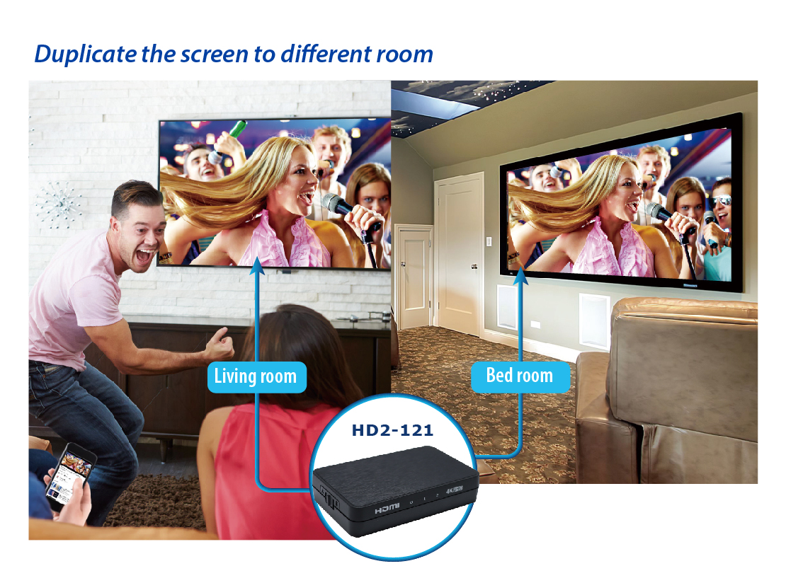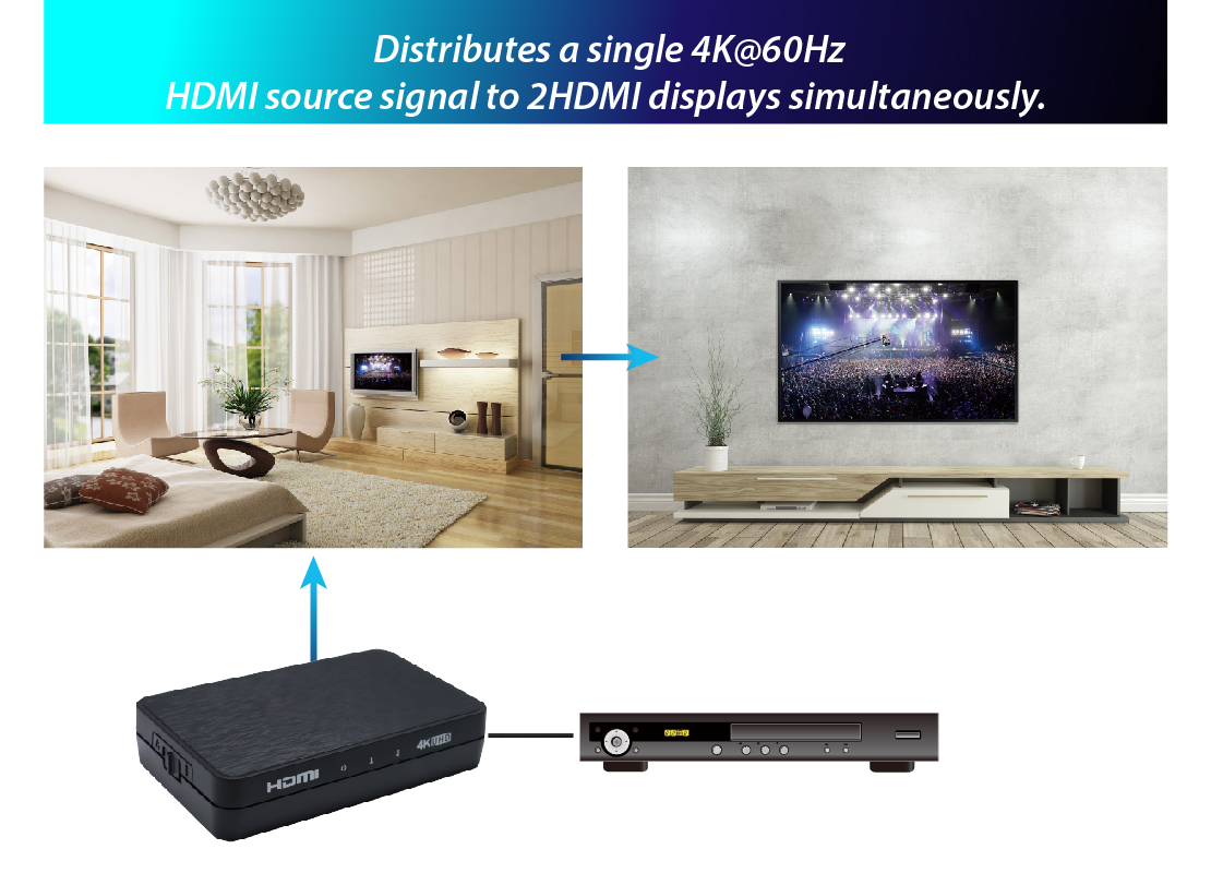 Trans' HD2-121 distributes HDMI video and audio from a single source device (UHD blue-ray player, 4K media player, PS4 Pro) to up to 2 HDMI displays (TV, projectors) simultaneously.