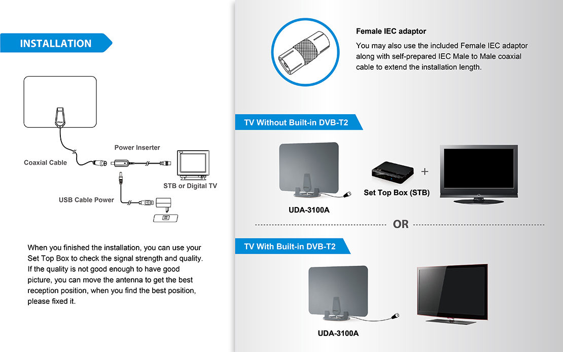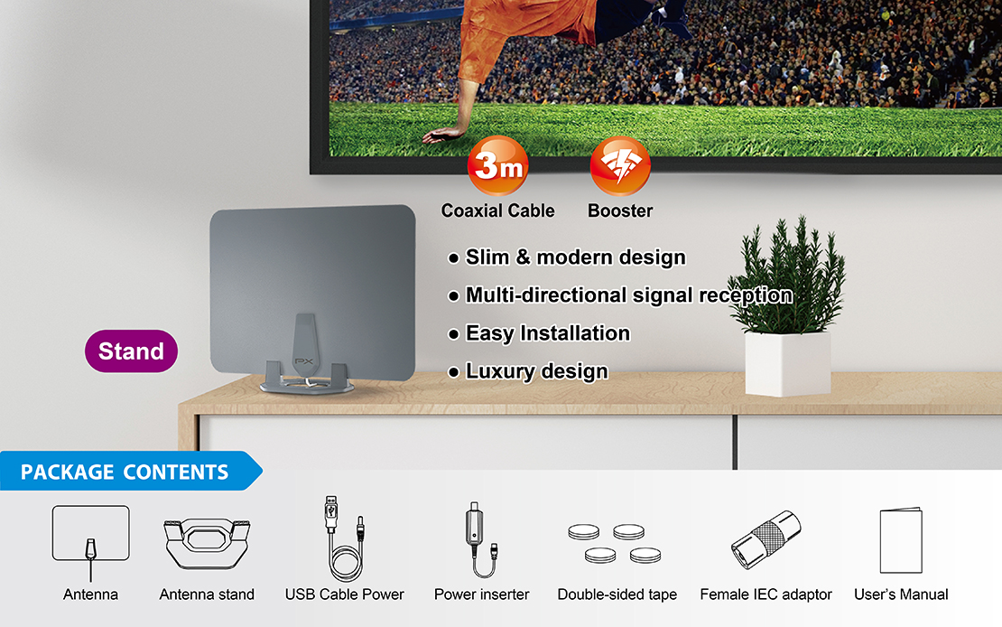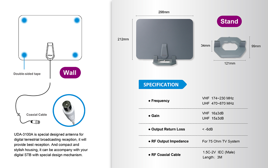 UDA-3100A paper-thin digital amplified indoor tv antenna allows you to receive free-to-air 4K UltraHD and crystal full HD 1080p TV channels. Working range up to 40 miles.
