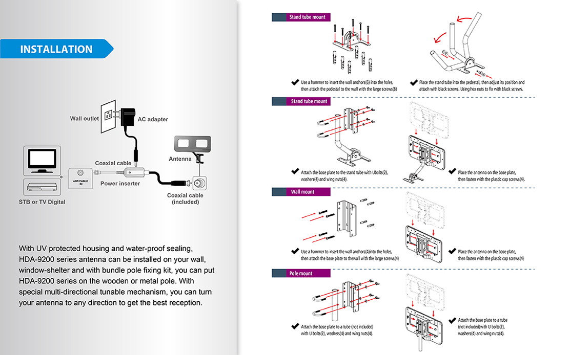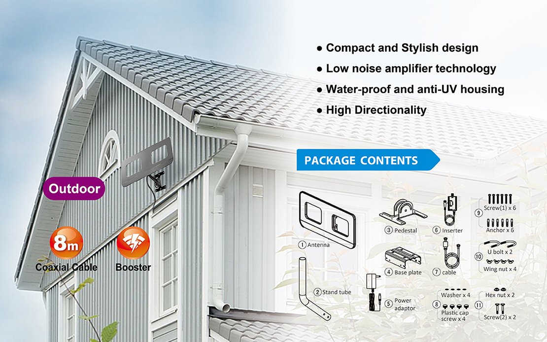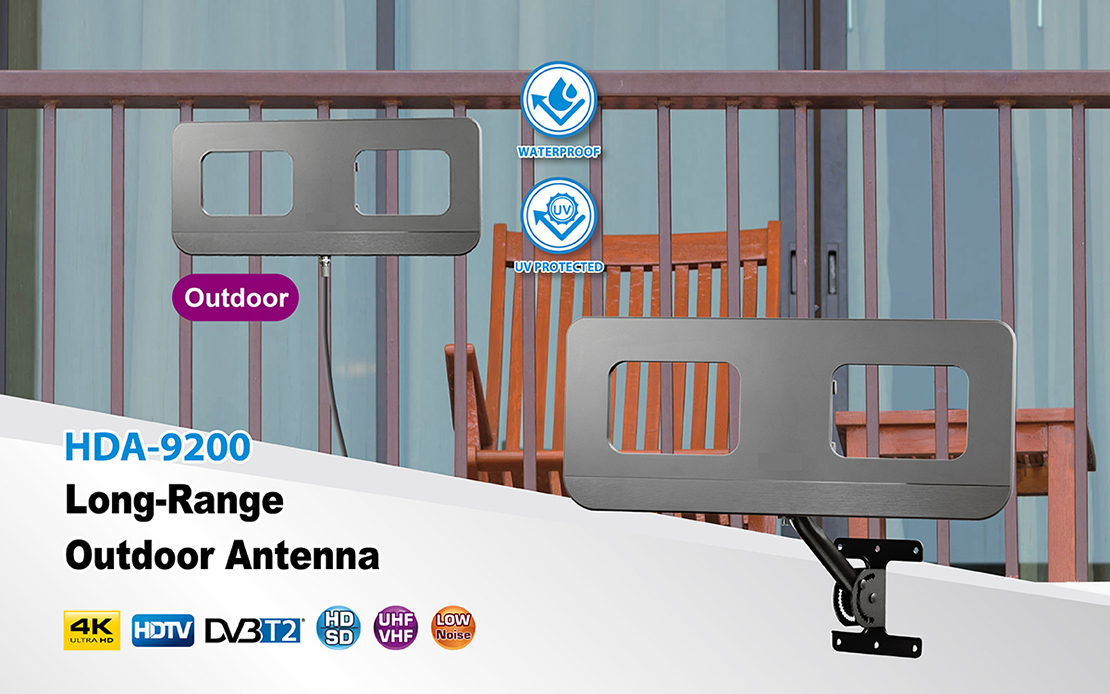 HDA-9200 Dual-loop digital amplified outdoor TV antenna allows you to receive free-to-air 4K UltraHD and crystal full HD 1080p TV channels. Supports super long range up to 60 miles.