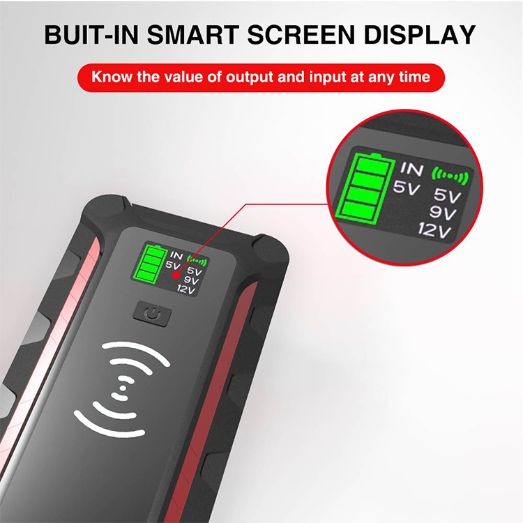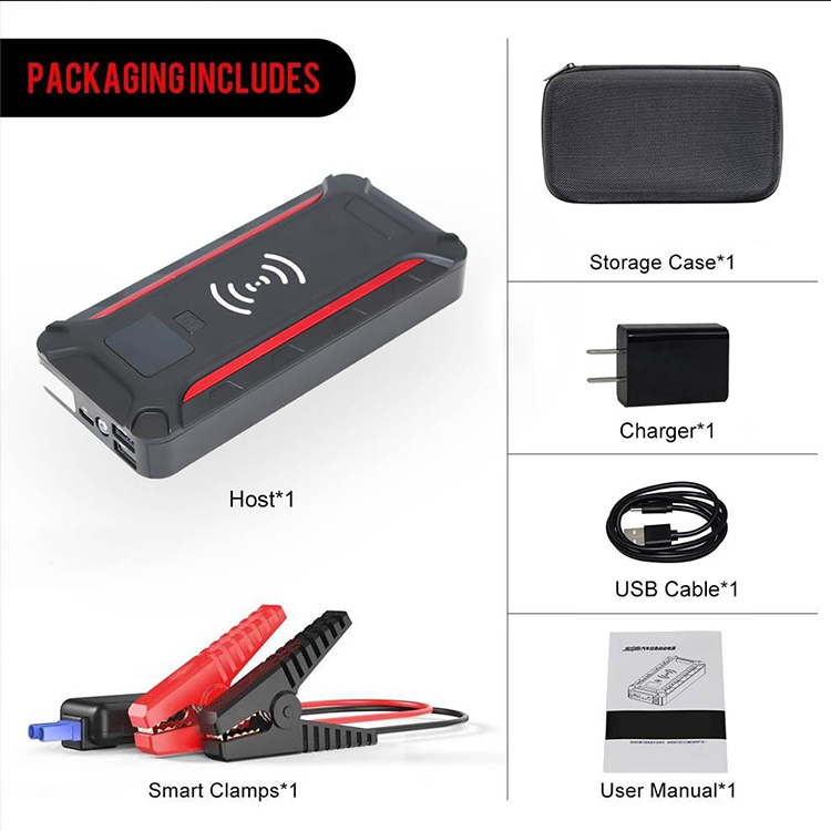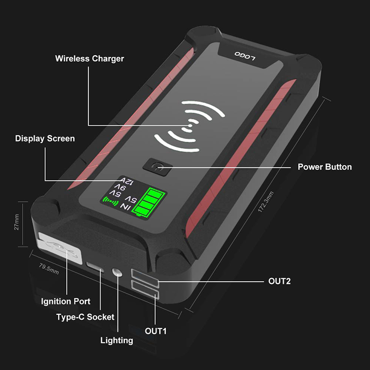 Model No. PS-D15 Battery Type High-Radio Polymer Lithium Battery Capacity 10000mAh Discharging Rate 60C Type-c Input DC 5V, 2A USB Output DC 5V, 2.4A EC5 Output DC 12V, 200A(starting)-600A(peak),Instant cuttent within 1s Working Temperature -20-60℃ Cycle Times about 1000 times(decay 70% afterwards) Dimension L200*W92.5*H30mm Weight about 350g Material ABS+ PC plastic,V0 level fire protection, safe and solid Wireless Output Power 10W | |