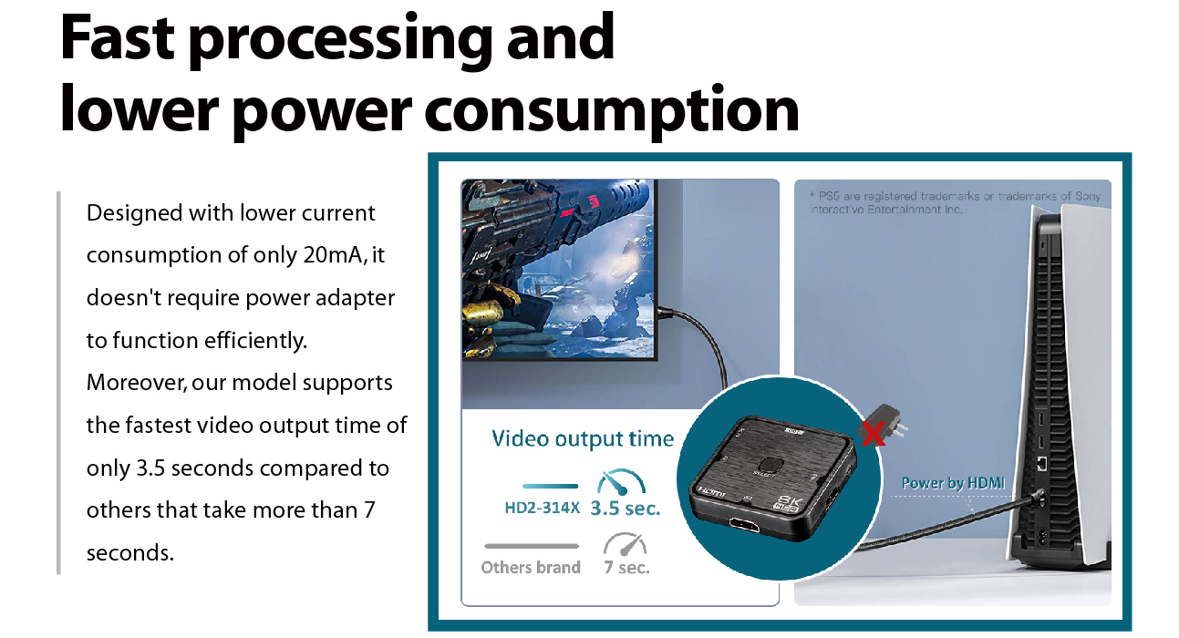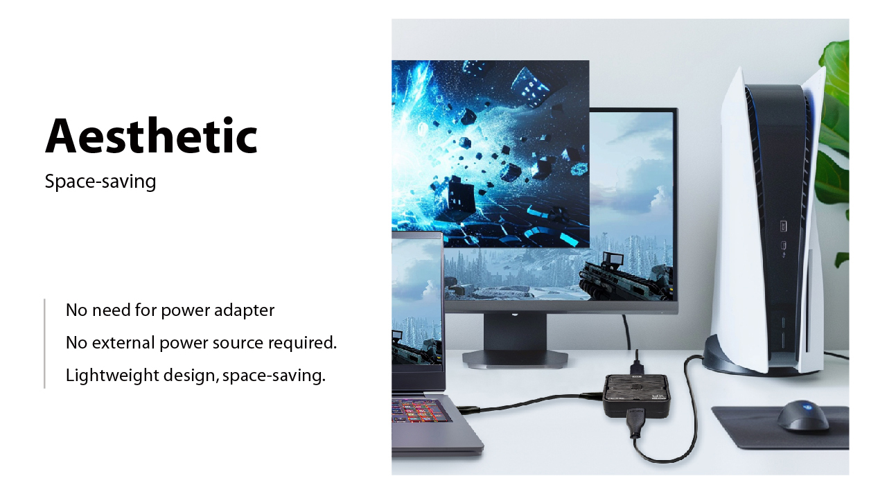 making it perfect for E-sports and gaming monitors. Its compact design facilitates easy integration into any gaming setup. The switcher quickly swaps inputs in just 3-4 seconds, operates with low power consumption, and does not require an external power supply.