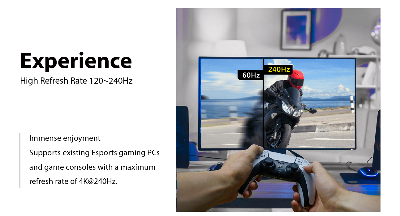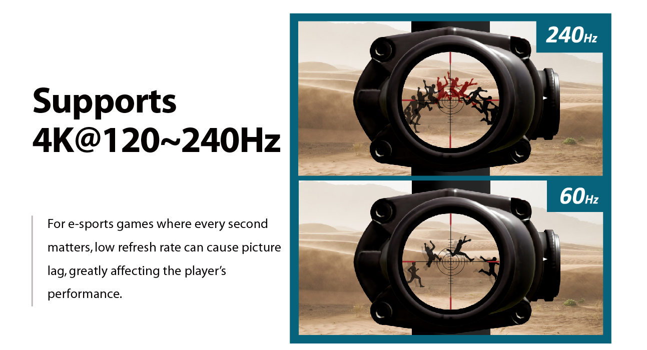 • Support 8K@60Hz / 4K@240Hz, 165Hz, 144Hz, 120Hz, 60Hz high frame rate