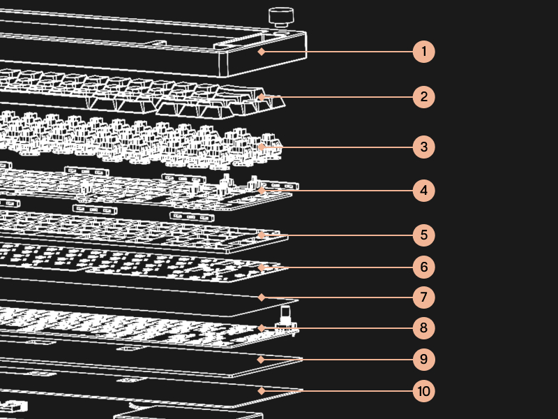 Experience quieter keystrokes with advanced sound-dampening materials, including sandwich foam, IXPE switch pad, PET sound pad, sound-absorbing foam, and EVA case foam.