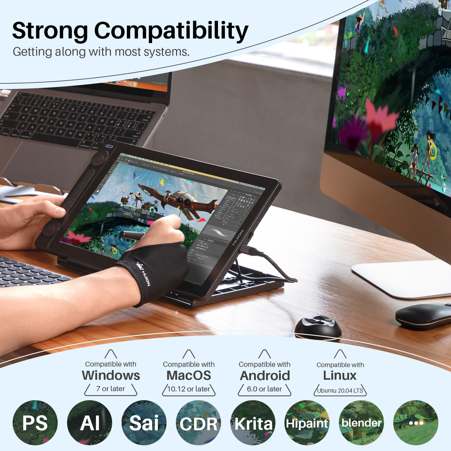 The surface material of Kamvas 13 (Gen 3) has been upgraded to Huion's latest anti-glare Canvas Glass, providing improved durability. The brand new Canvas Glass uses nano etching technology that evolves general anti-glare with anti-sparkle, which effectively reduces annoying image noise under a white background.