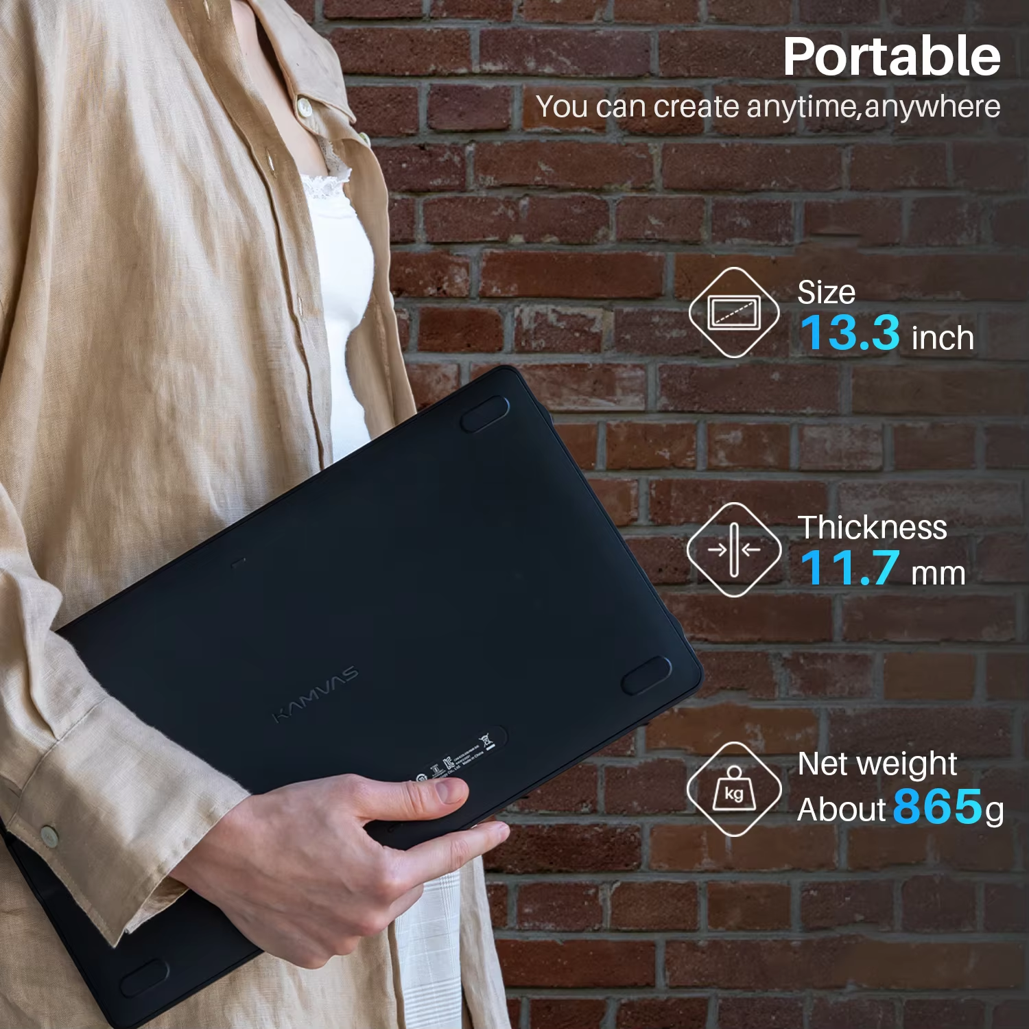 The overall size of Kamvas 13 (Gen 3) has been reduced by 8% compared to its predecessor, and its weight has decreased to 865g, making it easy to carry in your bag. The durable back cover offers superior protection, so you can take it wherever you go.