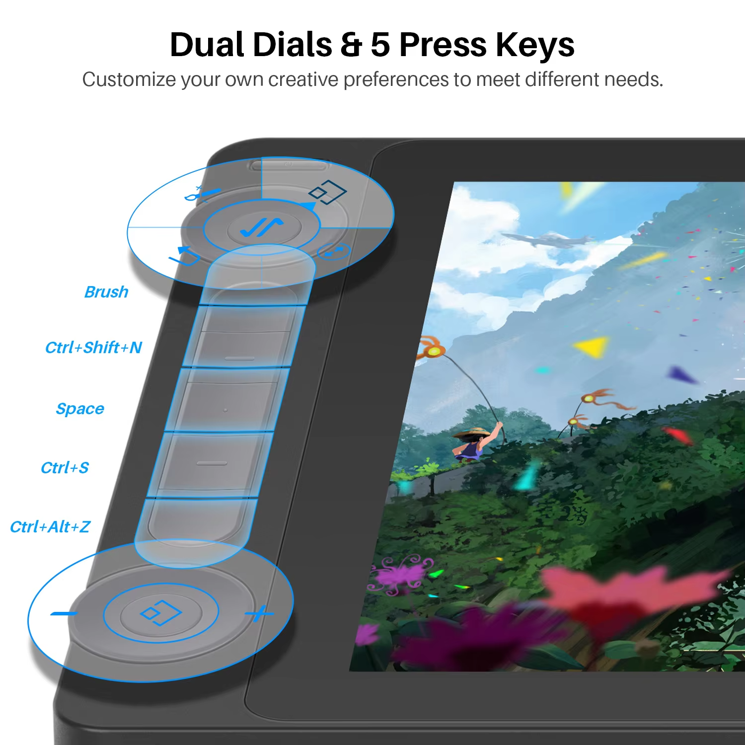 Kamvas 13 (Gen 3) is equipped with 2 dial controllers and 5 silent press keys, allowing you to precisely adjust canvas, brushes, sliders, flow, opacity, frames, parameter sliders, and more.