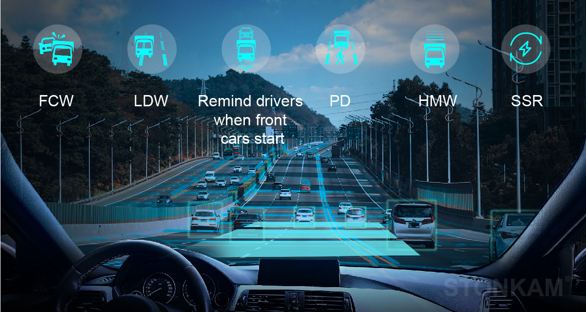 ADAS functions include forward collision warning (FCW), lane departure warning (LDW), pedestrian detection (PD), preceding car starting reminder, and speed sign recognition (SSR) & over speed alarm, which can warn drivers of potential collision risks and make driving safer.