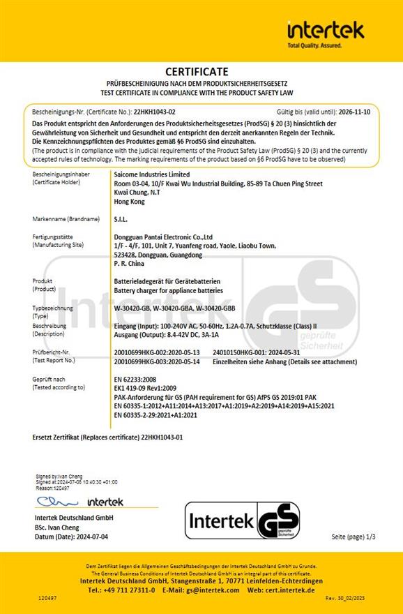 GS Battery Charger Certificate : Z1A 13 02 28823 149
