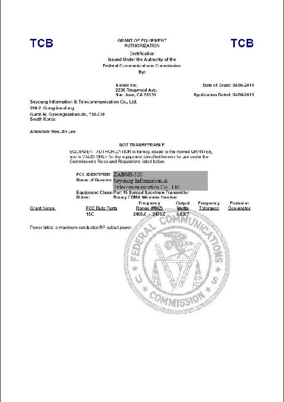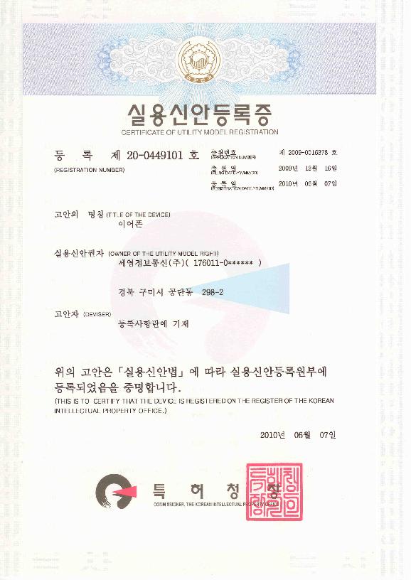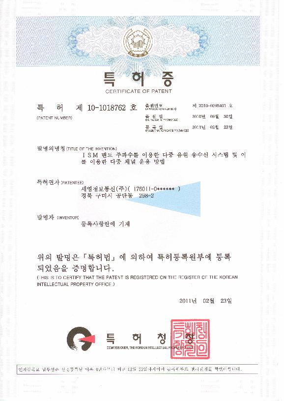 Certificate of Patent [SYSTEM FOR TRANSMITTING, RECEIVING MULTI VOICE USING ISM BAND FREQUENCY AND METHOD THEREFOR]