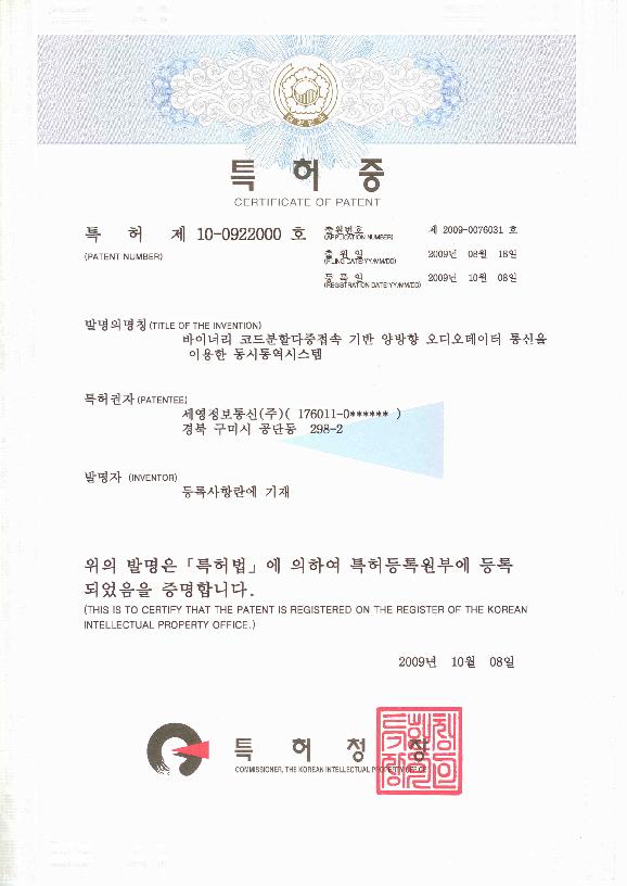 Certificate of Patent [SIMULTANEOUS INTERPRETATION SYSTEM FOR BIDIRECTIONAL AUDIO DATA COMMUNICATION BASED ON BINARY CDMA]