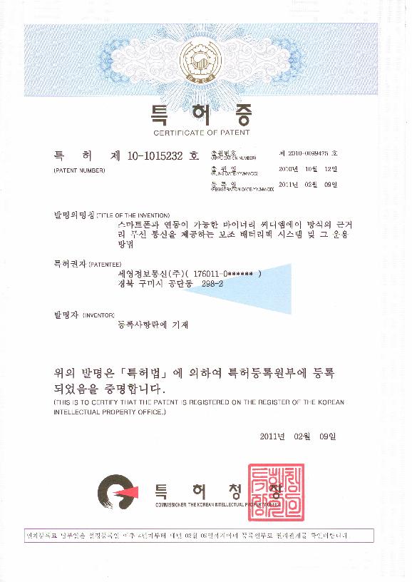 Certificate of Patent [SUB BATTERY PACK SYSTEM FOR PROVIDING BINARY CDMA STYLE OF LOCAL WIRELESS COMMUNICATION LINKING SMART PHONE AND METHOD OPERATION THEREFOR]