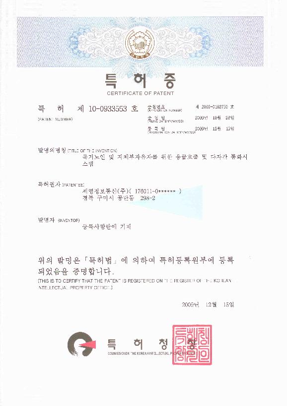Certificate of Patent [EMERGENCY CALLING AND MULTIUSER TELEPHONY CALL SYSTEM FOR SOLITUDE AGED AND CRIPPLE]