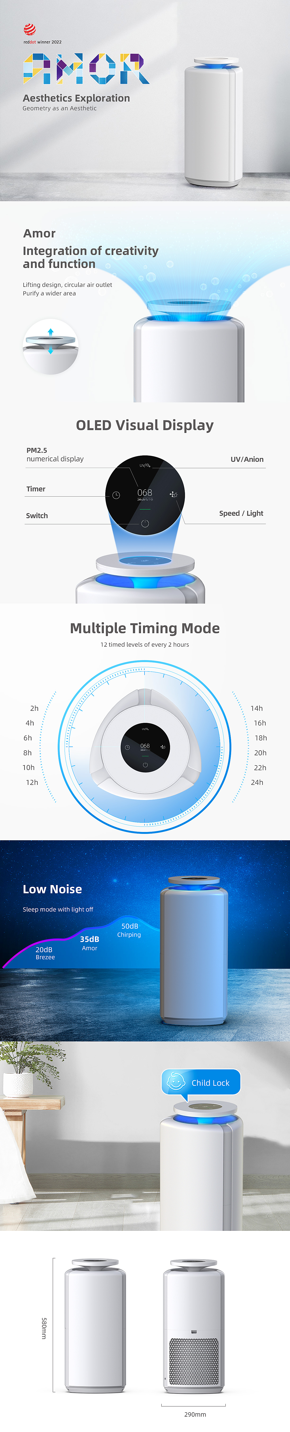• Lifting design,circular air outlet purify a wider area