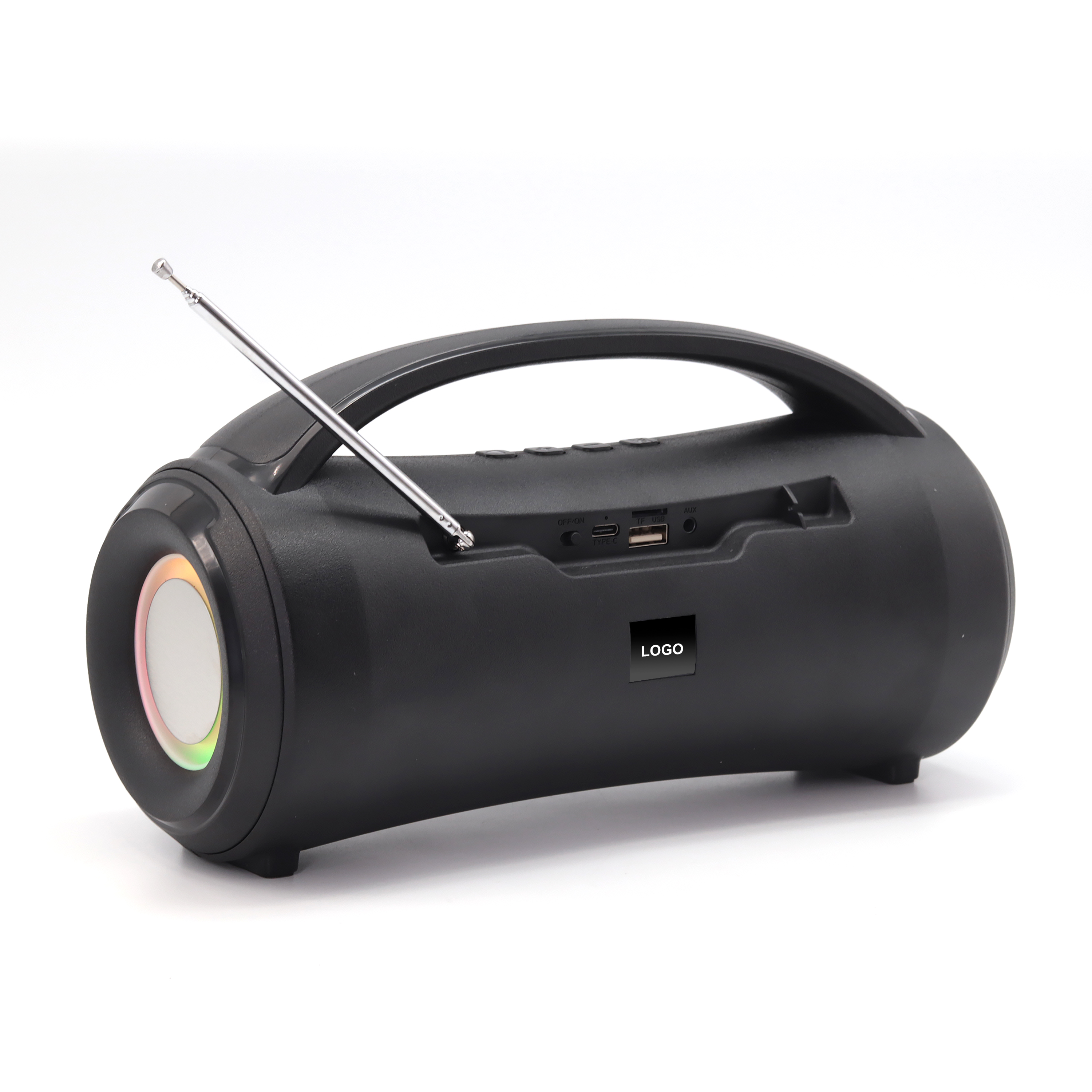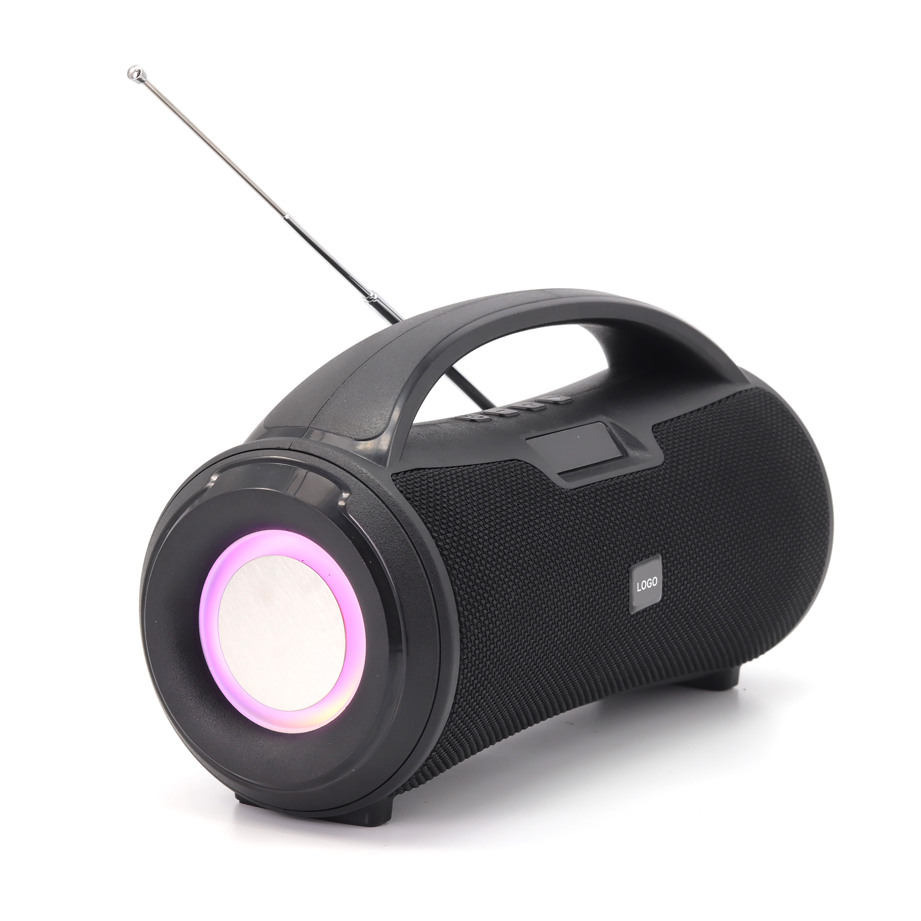 ● Features: excellent and deep bass sound quality+ scalable FM antenna + portable handle + LCD screen + cool RGB lights with 4 modes