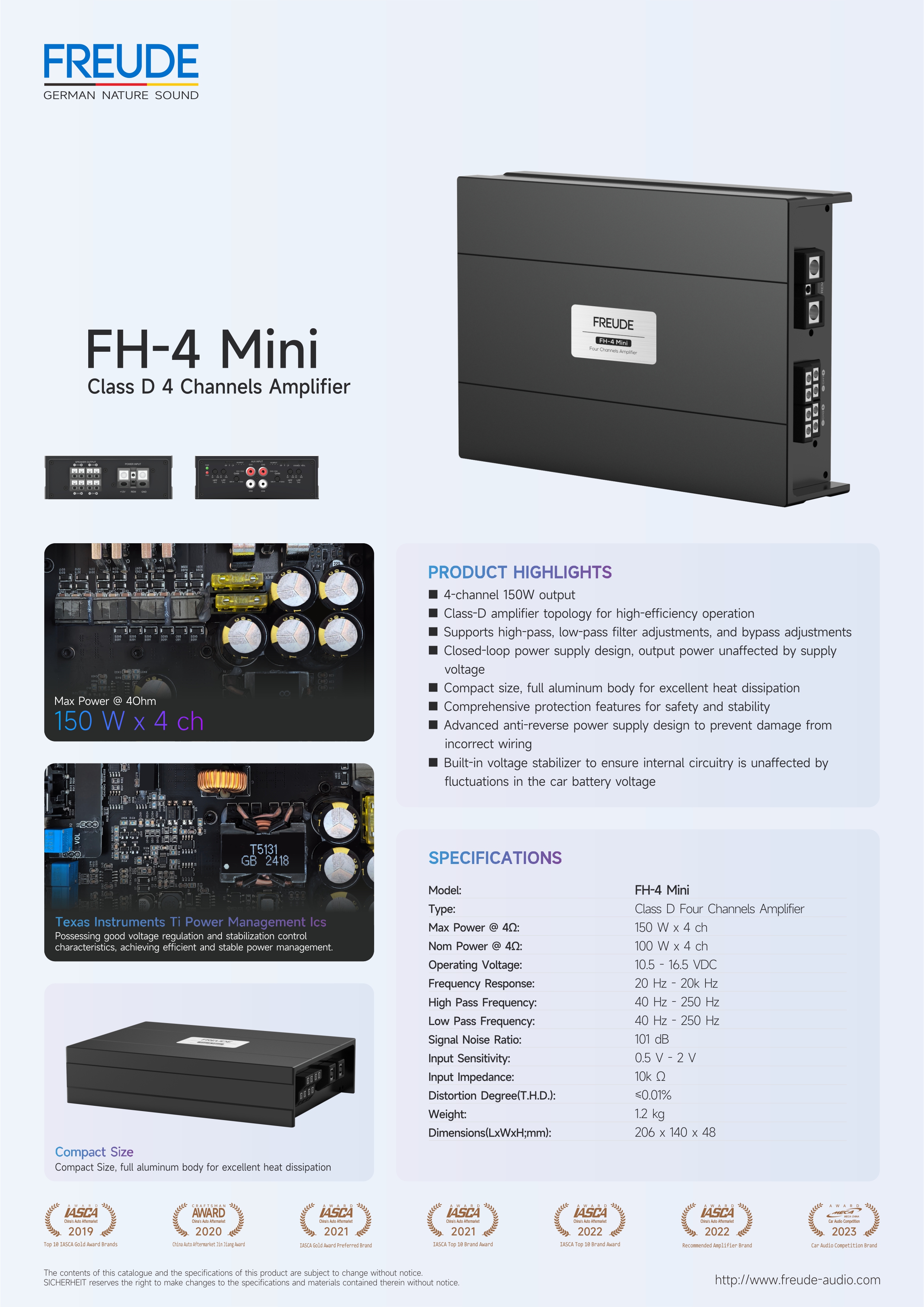 Model:    FH-4 Mini Type:    Class D Four Channels Amplifier Max Power @ 4Ω:    150 W x 4 ch Nom Power @ 4Ω:    100 W x 4 ch Operating Voltage:    8 - 18 VDC Frequency Response:    20 Hz - 20k Hz Low Pass Frequency:    40 Hz - 250 Hz High Pass Frequency:    40 Hz - 250 Hz Signal Noise Ratio:    101 dB Distortion Degree(T.H.D.):    ≤0.01% Input Sensitivity:    0.5 V - 2 V Input Impedance:    10k Ω Net Weight:    1.2 kg Dimensions (LxWxH;mm):    206 x 140 x 48Model:    FH-4 Mini Type:    Class D Four Channels Amplifier Max Power @ 4Ω:    150 W x 4 ch Nom Power @ 4Ω:    100 W x 4 ch Operating Voltage:    8 - 18 VDC Frequency Response:    20 Hz - 20k Hz Low Pass Frequency:    40 Hz - 250 Hz High Pass Frequency:    40 Hz - 250 Hz Signal Noise Ratio:    101 dB Distortion Degree(T.H.D.):    ≤0.01% Input Sensitivity:    0.5 V - 2 V Input Impedance:    10k Ω Net Weight:    1.2 kg Dimensions (LxWxH;mm):    206 x 140 x 48 Model:    FH-4 Mini Type:    Class D Four Channels Amplifier Max Power @ 4Ω:    150 W x 4 ch Nom Power @ 4Ω:    100 W x 4 ch Operating Voltage:    8 - 18 VDC Frequency Response:    20 Hz - 20k Hz Low Pass Frequency:    40 Hz - 250 Hz High Pass Frequency:    40 Hz - 250 Hz Signal Noise Ratio:    101 dB Distortion Degree(T.H.D.):    ≤0.01% Input Sensitivity:    0.5 V - 2 V Input Impedance:    10k Ω Net Weight:    1.2 kg Dimensions (LxWxH;mm):    206 x 140 x 48