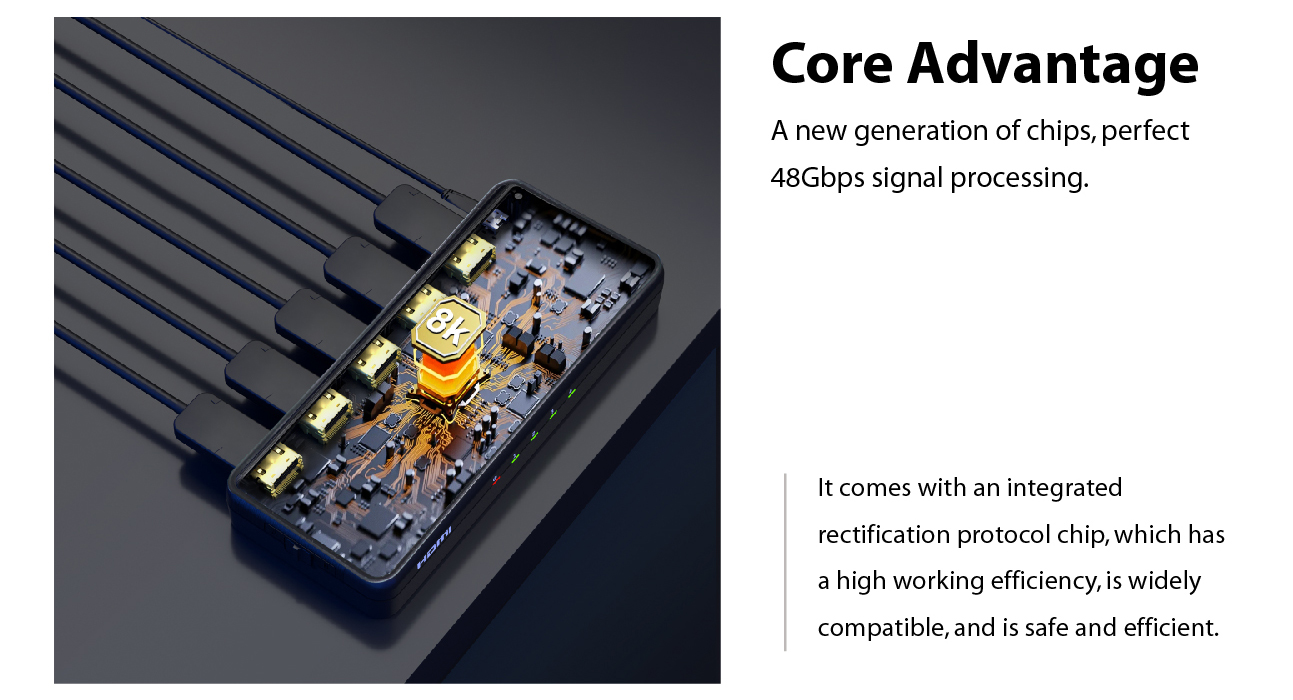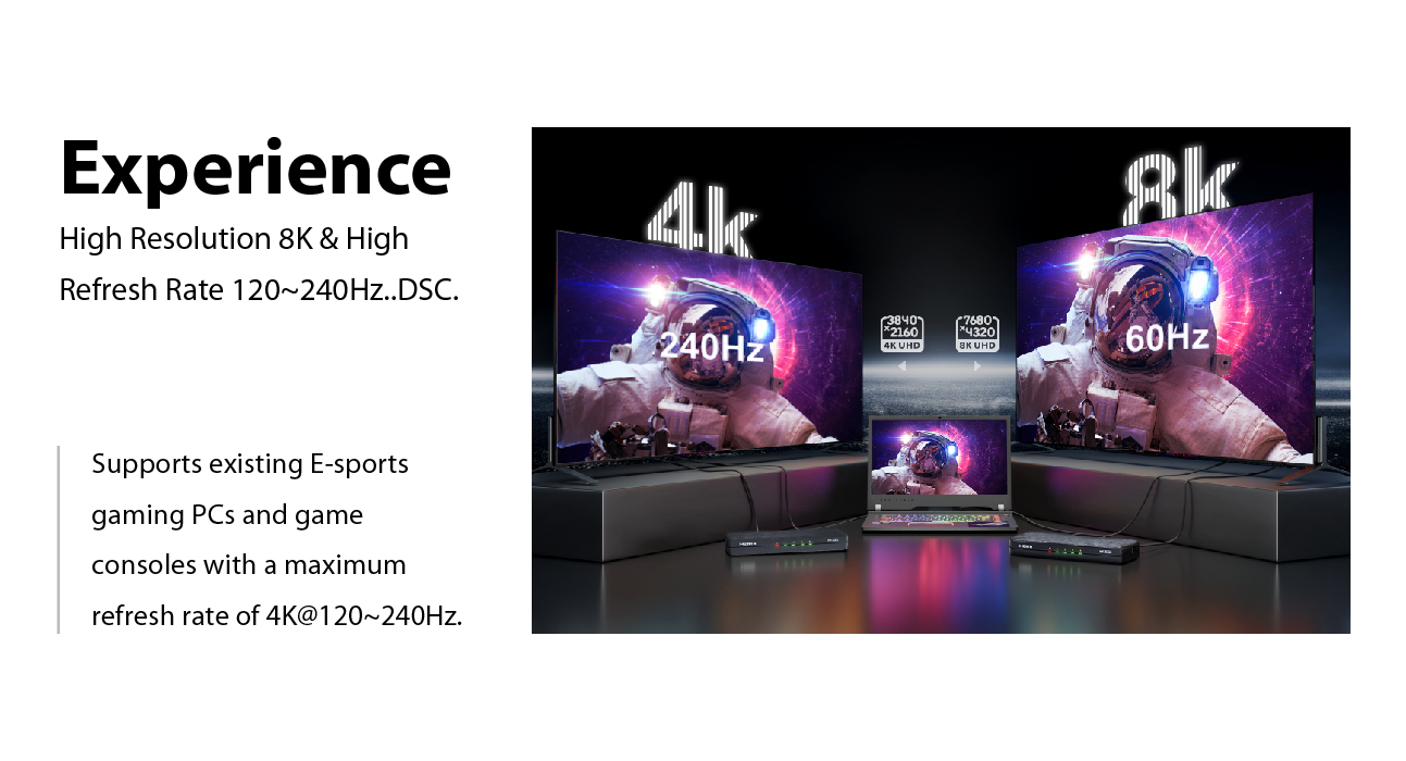 • Supports resolutions of 8K@60Hz, 4K@120Hz, 1080p@240Hz, HDR10, HDR10+