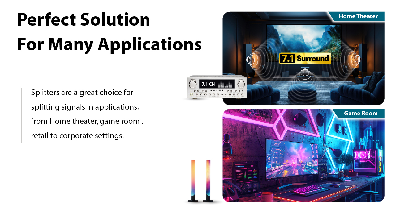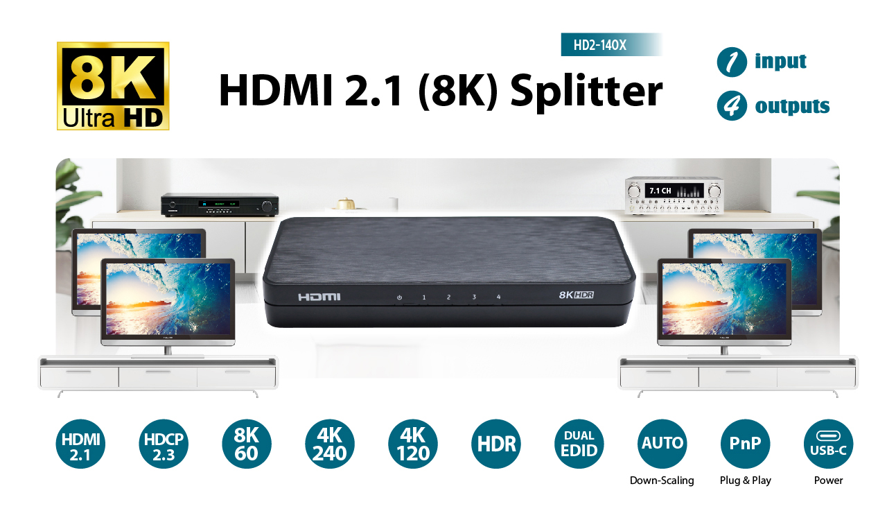 The HD2-140X is a splitter with one input and four outputs, seamlessly distributing both video and audio from a single source to two displays simultaneously.