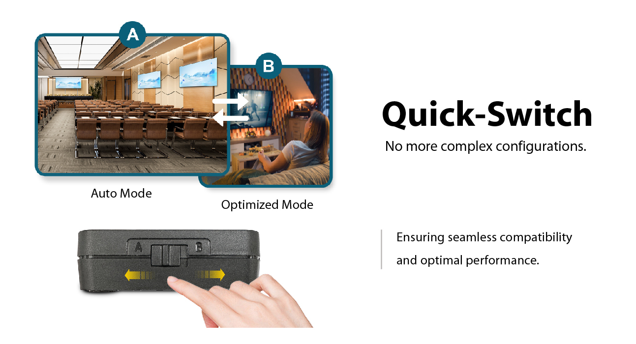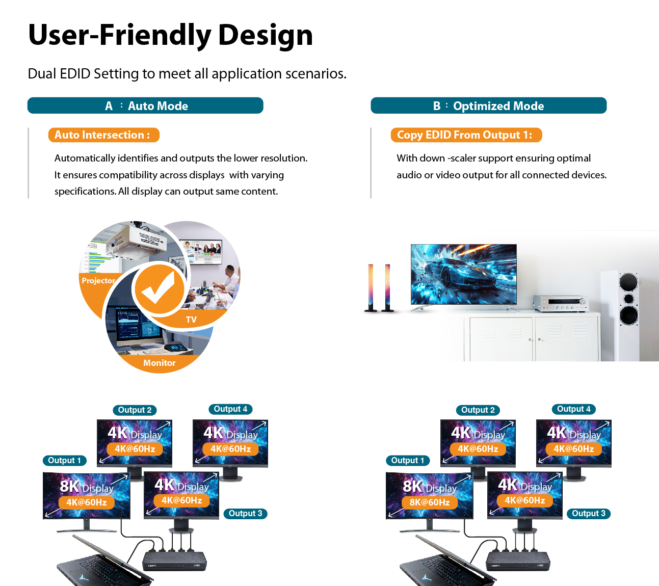 (A) Auto Mode: Automatically identifies and outputs the common resolution and audio format supported by both connected displays.It ensures compatibility across displays with varying specifications. All display can output same content.