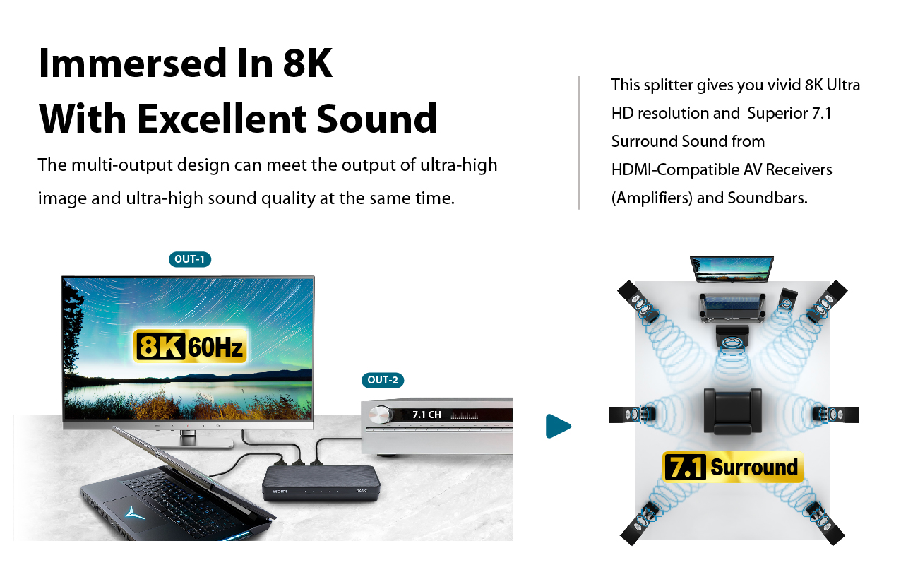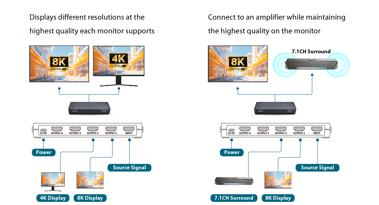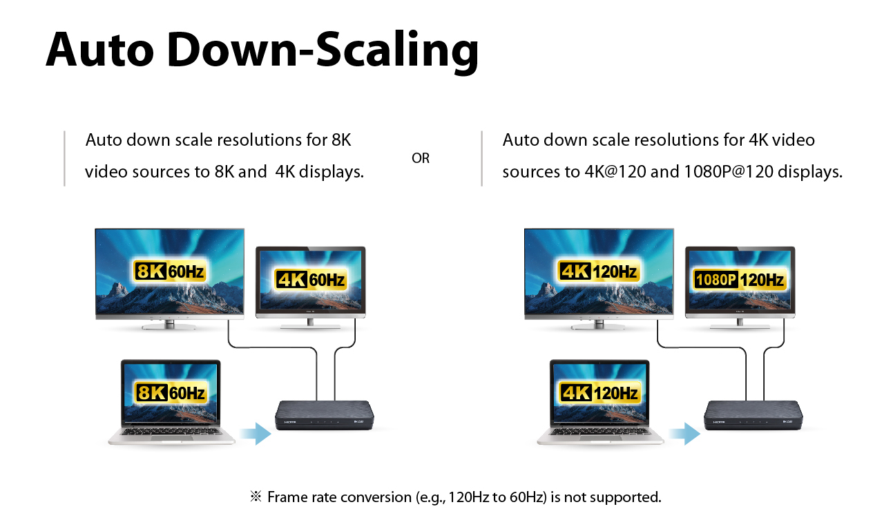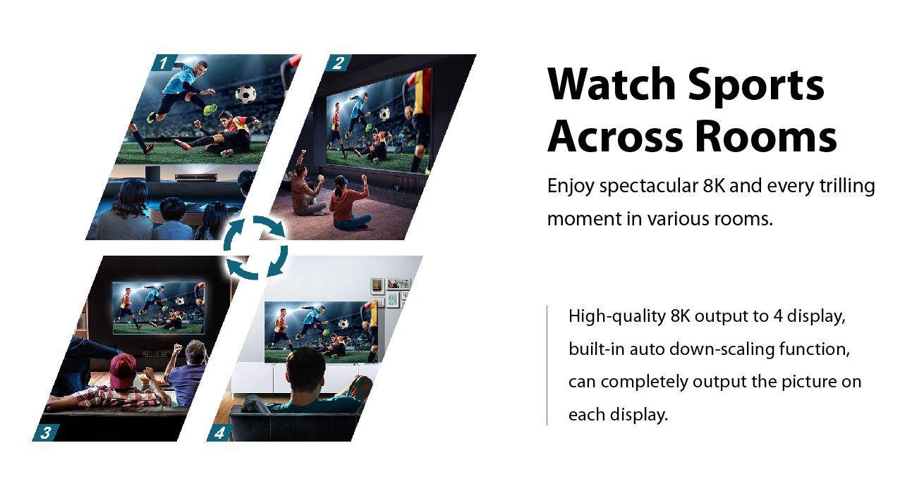 • Supports down-scaling for 8K content to 4K or 1080P displays