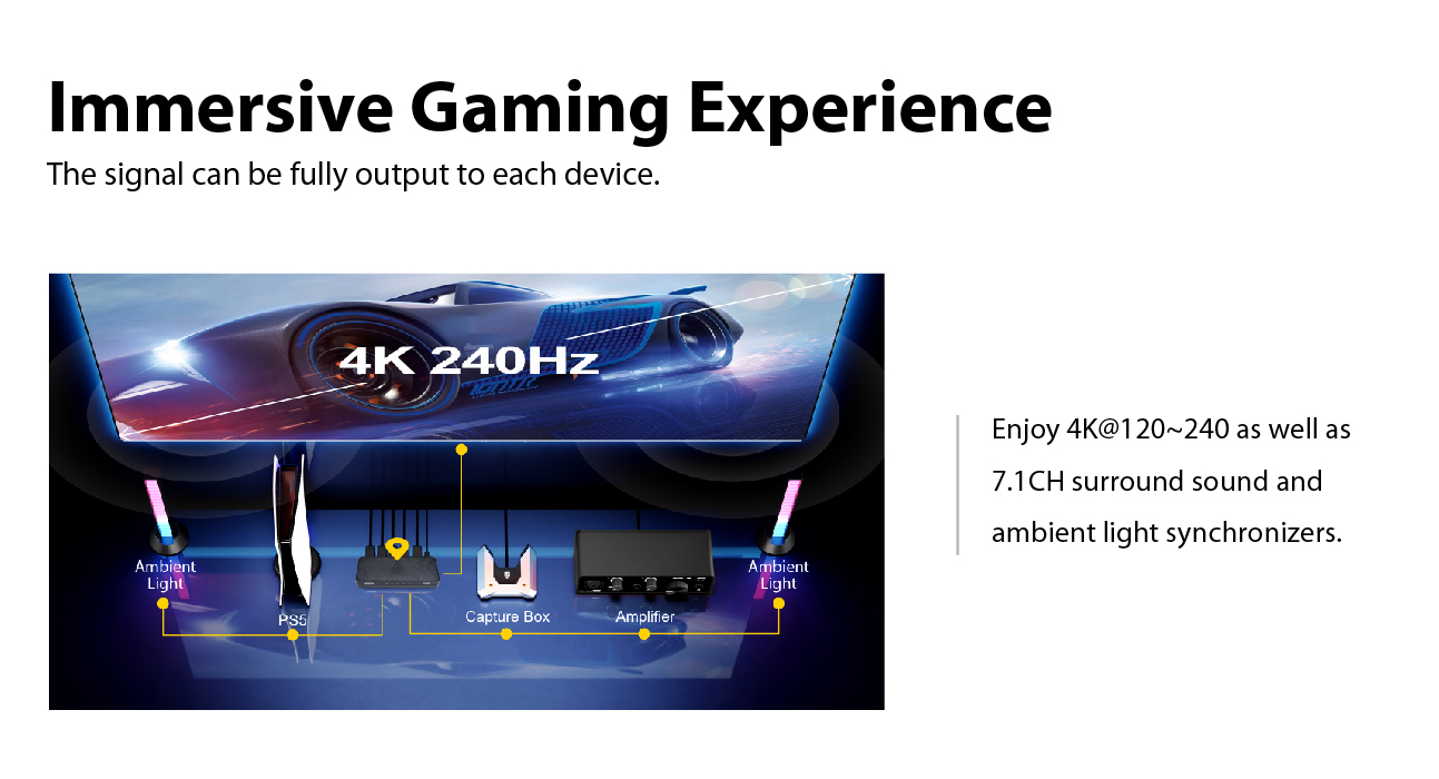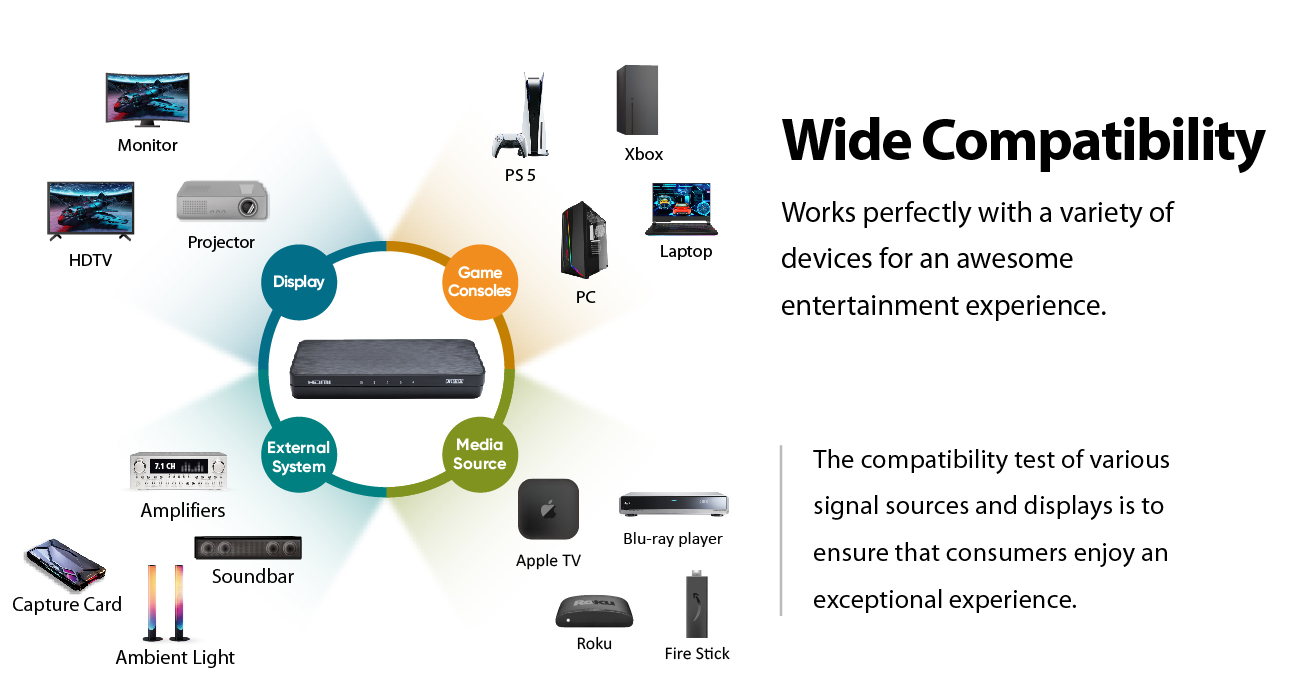 • Wide compatibility with gaming consoles such as PC, PS4 Pro, PS5, Xbox Series X. Also compatible with Blu-Ray Players, Chromecast, Roku, Apple TV, Fire Stick, Amplifiers, HDMI 2.0 Capture Cards (with HDCP), Philips Hue Sync Box, UHD TVs, Projectors, Monitors and more.
