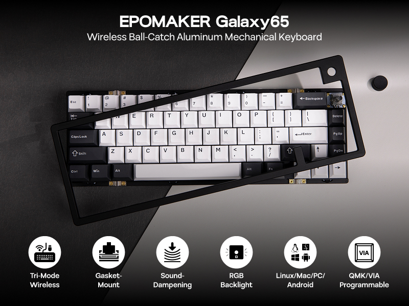 Following the EPOMAKER Galaxy70, Galaxy80 and Galaxy100, we are proud to present the innovative new member of the Galaxy Aluminum Keyboard series, with smaller size and greater functions. Introducing Galaxy65, the 65% compact layout wireless keyboard with ball-catch Gasket-Mount and VIA support.