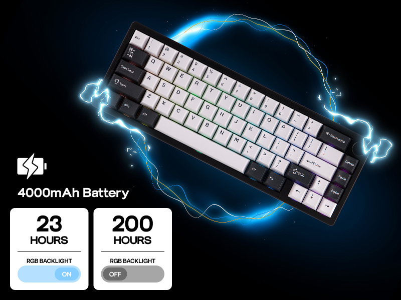 Upgraded in circuit design and battery quality, the Galaxy65 keyboard presents reliable and long-lasting wireless performance, offering an impressive 200 hours of use with backlight off on a single charge with a 4000mAh rechargeable battery.
