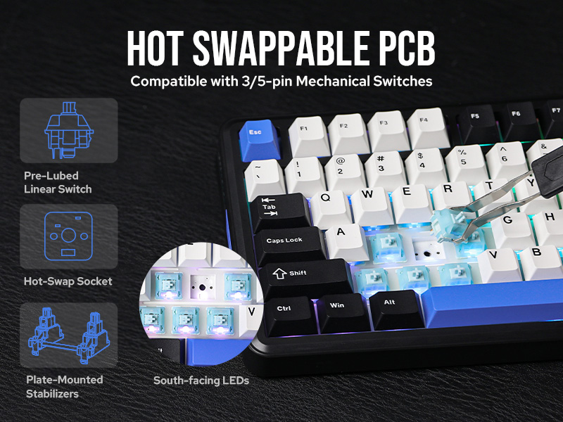 Unleash your gaming potential with the EPOMAKER TH85 - a customizable powerhouse featuring hot-swappable switches, well-tuned plate-mount stabilizers, and ergonomic cherry profile PBT keycaps for unparalleled comfort and performance.