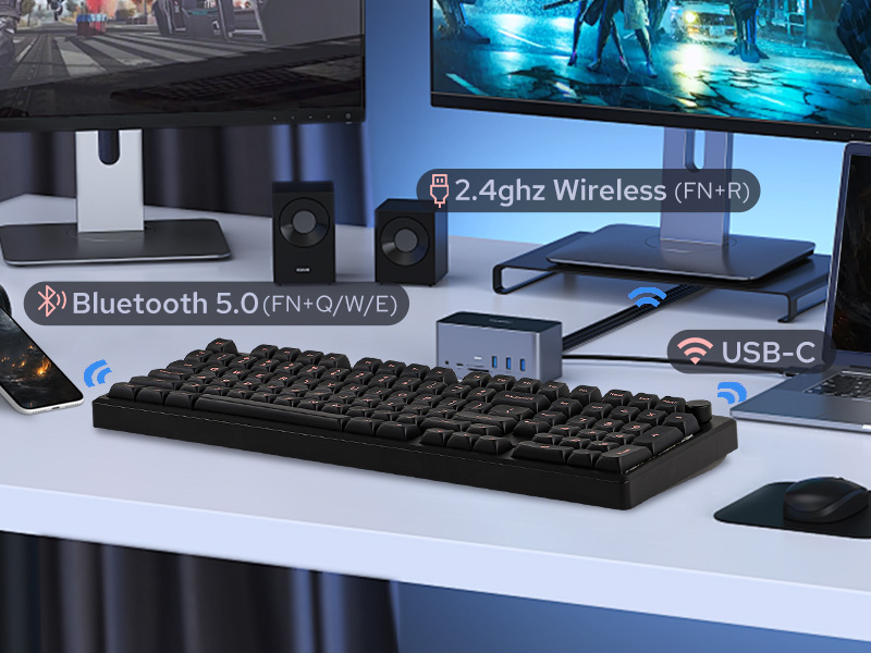 Powered by the outstanding 8000mah battery, the Galaxy100 keyboard gives you convenience and productivity. Packed with three modes of connection, the Galaxy100 keyboard offers reliable 2.4Ghz wireless, low-latency cable mode and the versatile Bluetooth connectivity.